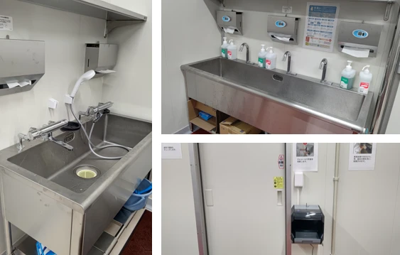 加工エリアへ入室する際は、手洗い・殺菌・身だしなみ確認をクリアしなければ入室不可とする仕組みを採用。